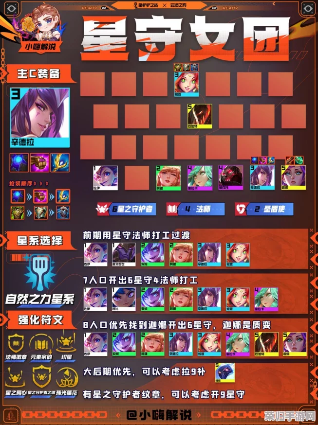 - 注意阵容的克制关系,如克制卡萨丁等前排C的阵容,但后期要防范猴子这类超高抗性主坦和AOE的瑞兹。