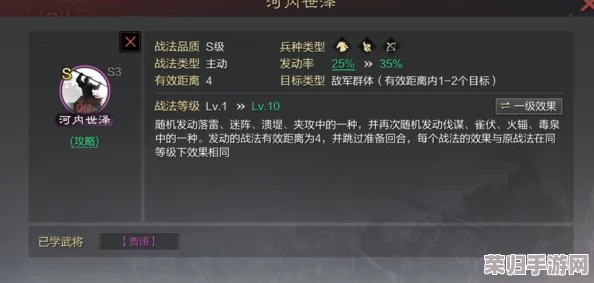 3、乱阵:当郭嘉携带了主动输出战法时,乱阵是一个不错的选择。